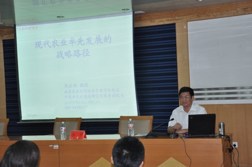 在接下来的环节中,周教授作为农村与区域发展领域的专家为在座学员作了题为“现代农业率先发展的战略路径”的专题报告。他从现代农业发展的背景与内涵,国外现代农业发展理论的经验与趋势等四个方面作了详细阐述。一个小时的报告不仅补充了学员的专业知识,而且帮助大家在丰富“三农”问题上有了更为深刻的认识。