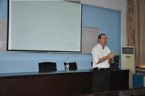 6月27日上午,我院党委书记段福兴教授、院长李平教授代表学院在学院219会议室会见了ESIC商学院代表团,并向代表团成员赠送了礼物,希望通过访问进一步推动实质性合作。之后,ESIC商学院代表团对9月份即将交换访学的我院两名同学进行了面试。10:00,代表团成员Gaston Fornes 博士在商学院学术活动中心为我院部分师生作了题为China-Latin America,the emerging markets’s axis,opportunities for business 的学术报告并和学生进行了交流。据悉,今年9月份,ESIC商学院将有4名研究生来我院进行为期半年的互换学习。
