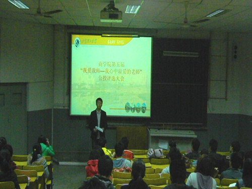 会议伊始,商学院学生会主席宁远对此次活动进行了介绍。此次活动是由校学生会主办的大型品牌活动,旨在动员广大同学评选出教学水平高,讲课质量好,关心学生,受同学们爱戴尊敬的老师。评选过程中,通过DV短片、播放幻灯片等各种形式,展现了老师们在教学成绩、学术成就、获奖方面的基本状况,从工作、生活等方面全面展示了参评教师兢兢业业、恪尽职守的工作作风和勇于探索、勤于钻研的良好学术风范,博得现场同学的阵阵掌声,紧接着学生代表慎重考虑后为所喜爱的老师投票,评选现场气氛十分热烈。据悉,此次评选共有八名候选老师,分别来自我院八个不同的专业,最后将从八位老师之中选出一名参加校级评选,评选结果将于近日公布。