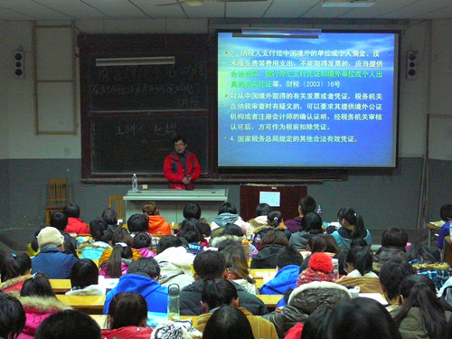 活动伊始,赵耀就全球税负痛苦指数排行榜引出中国税负较重的现状。随后,他讲到,中国会计准则虽然走在世界前列,但各项税法政策的落实却远不如发达国家。接着,赵耀将会计的核算基础及其计量属性与税法进行专业比较论述,用实地实际企业的实例生动活现的将复杂的会计及税法理论简单化。幽默的言语,并结合当前社会热点,赵耀将活动现场气氛一度引向高潮。最后,他将企业发票注意事项详细列举,并提出突发事件的补救方法。此次活动的举行帮助学生及时了解税法及会计的知识,逐步提高了自己的专业技能,进一步丰富了学生的课余生活,活跃了校园学术文化氛围。