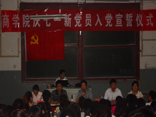 为使新党员接受党的教育,增强党性认识,在建党91周年即将当来之际,6月28日,在一号楼西合堂,商学院举行庆“七一”新党员入党宣誓仪式。学院党委书记、党校校长段福兴,党委副书记、党校副校长刘伟,团委书记郝鹏,辅导员董梅、赵峰峰及学生支部各支部书记和学生党员参加了此次仪式。宣誓仪式由赵峰峰主持。