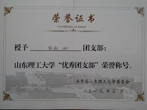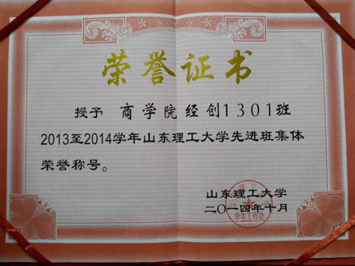 “勤学换来可喜成绩”。经创1301班自入学以来,被评为全国高校践行社会主义核心价值观示范团支部、校先进班集体(两次)、校红旗团支部、校优秀团支部、校特色团支部、校团支部风采大赛二等奖,成员共获得国家级奖项13项,省级奖励7项,校级奖项70项,院级奖项35项,累计证书达450余份,其中13人获校优秀学生奖学金,1人被评为院学习标兵,20人通过计算机二级考试,27人次通过从业资格考试。28人次在全国大学生英语竞赛、“认证杯”数学建模中国网络挑战赛、“大智慧”金融精英挑战赛、全国大学生网络商务创新应用大赛、齐鲁大学生创业计划大赛等国家、省级科创竞赛中获奖。班级所开设课程相对其他专业难度高,但班级挂科率低至5.41%,四级通过率为97.3%,六级通过率为90%