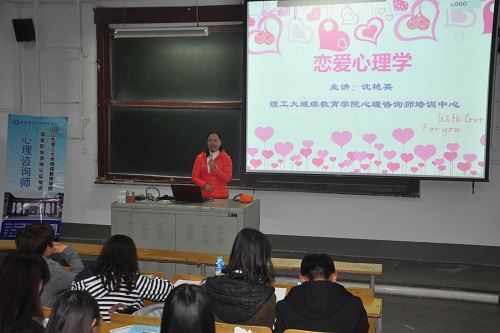 11月12日晚,卓越女生素质拓展会于一号教学楼西二合堂举行。本次活动由太阳成集团tyc122cc入口继续教育学院心理咨询师培训中心主任沈艳英主讲,通过她生动专业的讲解,在场的大学生对恋爱心理学有了更好的认识。