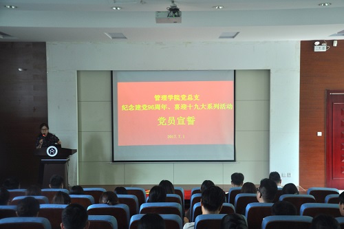 71日上午,管理学院党总支在四号教学楼二楼报告厅举行纪念建党96周年、喜迎十九大系列活动之观看视频辅导报告和党员宣誓活动,各党支部书记及学生党员参加此次活动,院学生科辅导员毛婷主持。