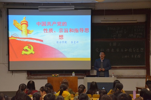10月25日晚,管理学院于一号教学楼东一合堂教室举行“党的性质、宗旨和指导思想”专题党课。此次党课由经济学院党总支副书记朱星辉主讲,管理学院辅导员于国良、经济学院辅导员毛婷及入党积极分子代表参加。