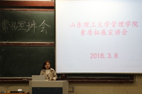 为强调素质拓展学分认证出现的相关注意事项,3月8日晚,管理学院于4号教学楼103教室举行素质拓展宣讲会,此次宣讲会由学院学生会素拓部部长李梦含主讲,15、16、17级部分学生代表参加。