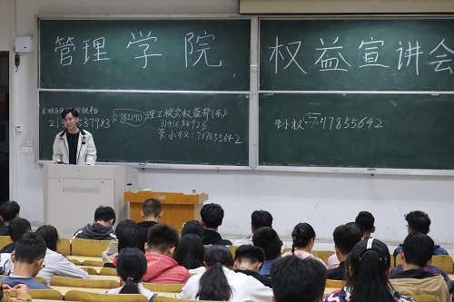 为进一步增强学生的正确权益观念,提升学生依法维权意识,10月10日晚,管理学院在三号教学楼310教室举行新生权益宣讲会。此次活动邀请校学生会权益部东校区负责人田欣帅主讲,院学生会主席黄勇、副主席张宗港、学生会权益部部长魏仁杰及相关成员和18级新生代表参加。