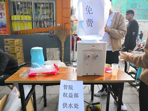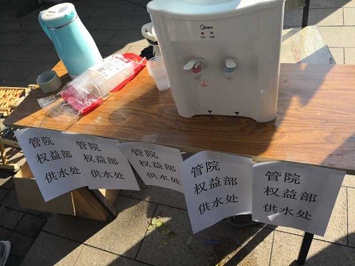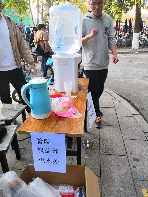 为了能让体测完的同学得到更好地调整和休息,管理学院权益部在体育场门口设置了临时服务台,为同学们免费提供水和板凳。