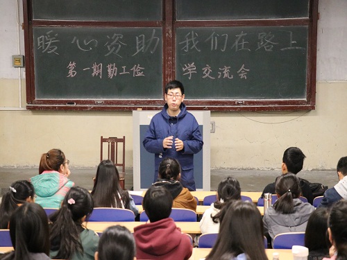 1115日晚,管理学院在四号教学楼104教室开展“暖心资助,我们在路上——第一期勤工助学交流会”活动。此次活动由院辅导员张仕杰主讲,部分学生参加。