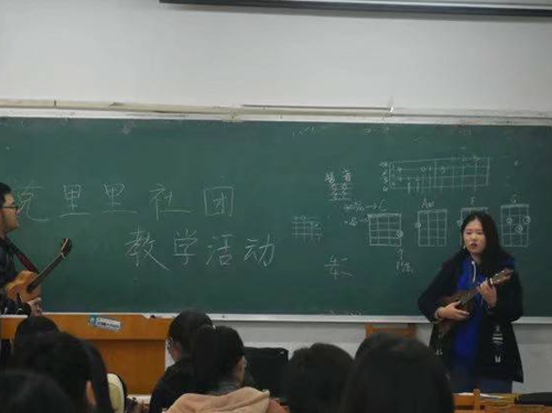 11月18日上午,Aloha尤克里里社团于3号教学楼202教室举行第一次尤克里里培训会。参与本次培训会的主要人员有:会长赵梦媛、技术部陈弘历等人。