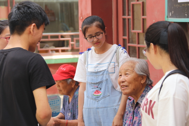 活动伊始,实践队的队员们走进养老中心的大厅,帮助老人们做眼保健操。随后,在养老中心的负责人的带领下,队员们来到养老中心的8楼。老人们见到队员们的到来,脸上充满笑容。队员们也亲切地拉着老人们的手,询问他们身体、日常生活、饮食起居的情况。在敬老院负责人进行分工后,队员们便行动起来,带领老人们来到3楼的户外平台。老人们坐在长椅上与队员们聊着他们过去的生活。其中一位老人说到:18岁就成为了共产党员,参加过很多抗日战争,并且我的老伴曾参加过抗美援朝。大家在与负责人的沟通了解到,老人们每天都会在护理人员的陪同下出来散步,但由于护理人员人手不够,每天能够出来活动的老人数量有限,所以他们非常欢迎志愿者的到来。20分钟左右的户外活动结束后,队员们把老人送回他们自己的房间,与老人们聊天解闷、话家常、讲历史。临行前,队员们和老人围在一起集体拍照。