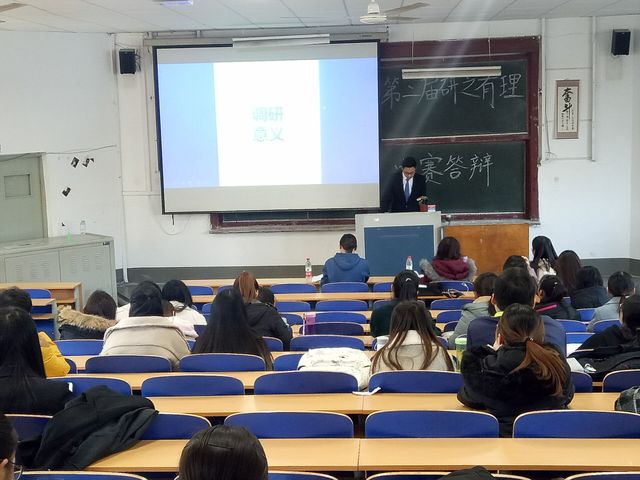 “研之有理”比赛是以调研策划为主的学科类比赛,是调研中国的模拟大赛。参赛队伍于赛前精心准备,积极搜集资料、深入实地调查、设计调查问卷,依据制作的调研策划方案,为大家呈现了一场精彩绝伦的比赛。比赛期间,在规定时间内,选手从容走上讲台,以洪亮的声音,结合团队设计的ppt充满自信的团队的调研方向、调研目的、调研设计及意义讲解给同学们及评委,与同学们分享自己对社会问题的思考与见解。赛场上,最吸人眼球的是各位评委与比赛队员之间不同思想的碰撞。各团队答辩完成后,三位评委依次对参赛选手进行悉心地点评与指导,帮助参赛选手进一步修改完善自己的调研策划方案,使选手更加清楚地理解调研的目的与意义,在调研的道路上可以取得更大的进步。
