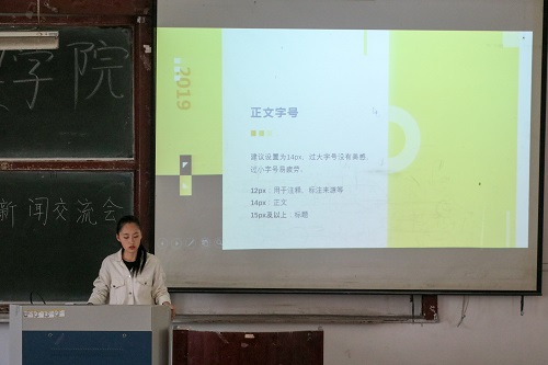 此次交流会共分为微信推送讲解及摄影技巧交流两部分。活动伊始,边峻琳向在座同学介绍了如135编辑器、秀米等常用的微信推文编辑软件,并根据往期微信推文截图向同学们指出推文中可能存在的常见性问题,给出了合理的解决方案。接下来,她又讲解了字间距、行间距、字体大小等校园微信推送中需要注意的细节问题。同时,她通过图片直观地对比了微信推文修改前后排版效果的不同,加深了在座同学对排版重要性的认识。