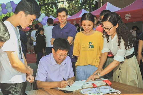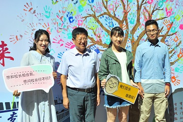 在迎新过程中,校党委副书记、校长张铁柱同有关校领导相关职能部门负责人以学院党总支书记高厚礼院长程钧谟、党总支副书记高静静学院相关领导、部门负责人共同看望学院新生及迎新工作人员,领导们来到各专业报道处详细了解新生报道情况,慰问迎新工作人员。活动中,张铁柱校长听闻今天刚好是两位新生的生日,便为他们精心准备了有关管理学书籍题写祝福语,作为生日礼物赠予两位同学同时也作为新生入学礼物,表达了对管院新生学子的殷切期望与嘱托最后,领导们与新生在背景墙前合影留念。