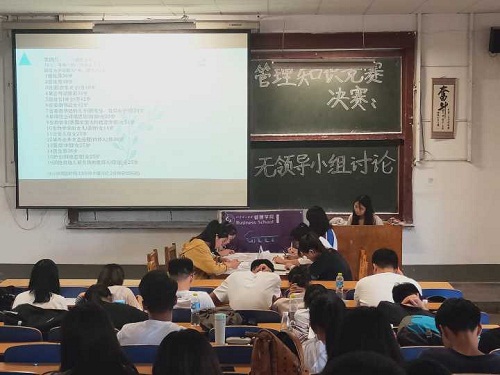 比赛伊始,主持人吉碧霞逐一介绍决赛评委,并向同学们讲解“无领导小组讨论”的规则。随后,监察评议部成员刘晓艺上台发言,保证了比赛的公平性。接下来,管理知识竞赛决赛第一场正式开始。各小组参赛成员按序号就坐后,随机抽取案例并有3分钟的时间进行审题。随后,参赛小组有10分钟的小组讨论时间。在小组讨论过程中,各小组成员分工明确,确定了领导者、时间管理者、记录者的角色分配。小组成员纷纷踊跃发言,提出自己的见解和建议。经过一番激烈的讨论后,由小组选出代表进行总结陈词。接下来,由评委组对各小组成员在无领导讨论中的表现进行点评,表扬小组成员的优点,同时也指出不足之处。评委组强调,主要问题是时间把握不够,分析题目不全面,总结不到位、讨论氛围不积极等,并有针对性的提出相关建议,有效的帮助同学们更好的参赛。比赛如火如荼地进行着,参赛小组逐一上场。最后,两场比赛顺利结会长王肖肖向参赛成员表示感谢。