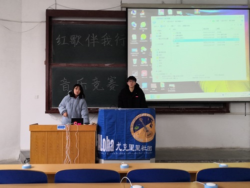 1130日上午,Aloha尤克里里社团于东校区四号教学楼103教室举行红歌伴我行音乐竞赛活动。此次活动由社团会长赵梦媛主持,社团联合会副理事长张明路、稷下文化社东校负责人张继涛和校艺术团优秀个人信长辉担任评委。社团干事以及全体参赛人员参与。
