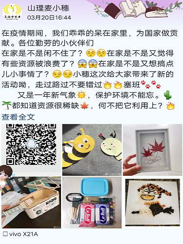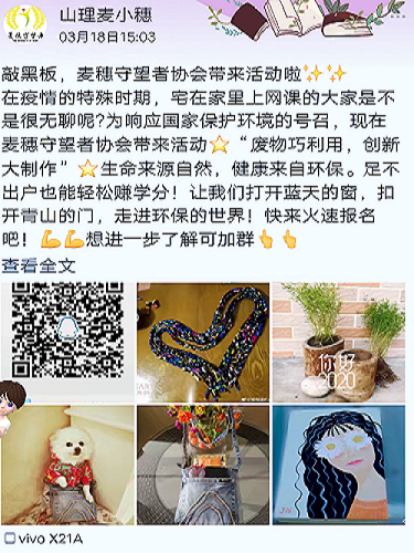 麦穗守望者协会宣传人员通过QQ运营号山理麦小穗在QQ空间发布了宣传文案,每天发布一篇文案积极宣传活动,同时在到梦空间向同学们介绍活动相关信息。活动进行之前,工作人员们首先展开准备工作,建立投票群,便于参赛人员提交作品和进行投票。宣传进行第一天有许多同学加入投票群,向工作人员询问活动有关内容,工作人员积极为同学们解疑,介绍活动环节和有关事宜。此次比赛旨在让同学们利用自己身边的废品和不能穿的衣服等物品,经过创新创作变成能再次利用的物品。同学们表示在疫情期间积攒了许多废品,希望通过自己的双手使它再次发挥作用,同时也减少垃圾的产生。此次活动不仅能锻炼同学们的动手能力和创新思维,也能增强同学们勤俭节约和爱护环境的意识。