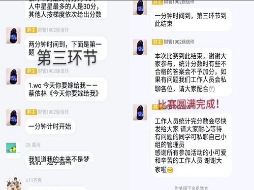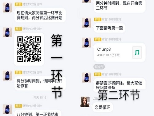 比赛前,全体参赛同学在工作人员的组织下紧密协作,进行赛前试玩,为活动的开展打下基础。活动开始时,同学们准时参加积极参与。比赛时,参赛同学积极答题。首先是线上答题,参赛同学争分夺秒,尽力将自己的所知所学交付于答卷。随后是第二环节听歌识曲,同学们都慧耳识曲,积极作答,答得心中所想,尽力取得最佳成绩。最后是歌词接龙环节,参赛同学博闻强识,将一个单字引得一句句余音缭绕的歌词,群情激昂。