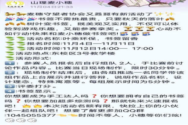 为响应党的十九大提出的建设美丽中国、攻克生态领域突出问题的理念,增进大学生对生态环境的了解,树立其环保意识,麦穗守望者协会于11月4日至11月12日开展“叶乘环保,书签留香”的宣传活动。
