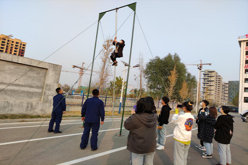 期间,我们的初赛晋级小组成员赵宏吉同学对爬杆训练进行大胆尝试,其优秀的臂力以及良好的身体素质得到消防工作人员的赞赏。