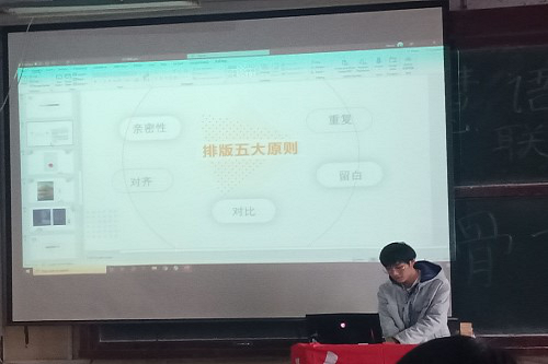 活动主要分为两部分,第一部分内容是海报的设计,分别是关于海报的排版、平面构成所具备的要素、如何把控好构图、实际案例分析四个部分。引用故乡文化展海报为案例,进行详细地讲述,实际举例使同学们更好吸收和理解所讲内容。接着着重讲解排版的五大原则,分别为:亲密性、对齐、对比、留白、重复。每个原则鲍东轩都认真讲解,并和同学们积极互动,认真解答同学们的困惑。第一部分讲解完毕,同学们对海报设计有清楚的认识,对排版的五大原则也有更深层面的了解,同时也对宣传部的工作职责更加了解。
