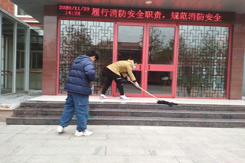 迎着暖阳,九名志愿者在学校门口集合后,乘坐88路公交车到达金乔老年公寓。董凯悦与公寓负责人在经过一番交谈后,志愿者们进入老年公寓。由于新冠疫情原因,更为爷爷奶奶的身体健康考虑,志愿者们并没有进入室内与他们交流,而是承担起打扫户外卫生的责任,为他们创造出干净整洁的居住环境。在董凯悦的指挥下,志愿者们两两分工,两人扫院落,两人扫长廊,两人擦窗户,两人拖地。即使在凛冽的寒冬中,九名志愿者们也是干劲满满,凝望着窗户里的爷爷奶奶们,志愿者们更是充满干劲,努力工作。然而快乐而有意义的时光总是短暂的,打扫完卫生后,志愿者们也纷纷离开老年公寓,完成了此次志愿活动。