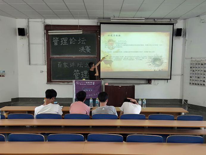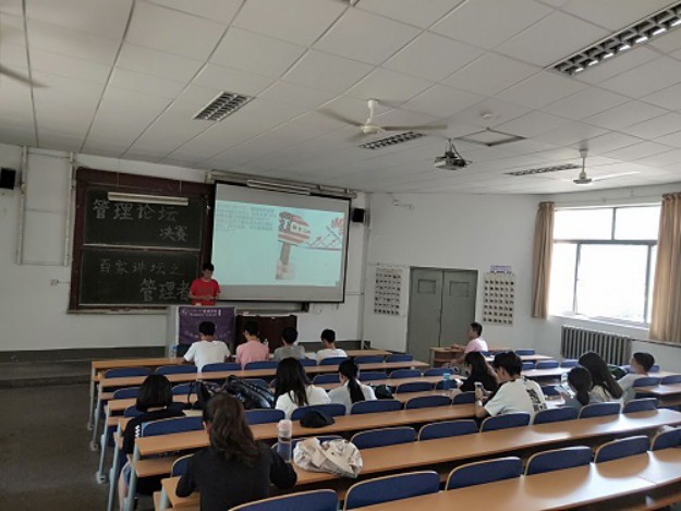 初赛结束之后,管坛活动负责人公布决赛答辩顺序,便于参赛者提前做好准备。答辩开始前,管坛成员做好贴条幅、写黑板字等准备工作,提醒参赛者将本小组的PPT拷贝到电脑上。答辩过程中,参赛成员以任正非、宗庆后等优秀企业家、管理者为例,通过展示PPT、播放视频等方式向大家分析管理者在企业成长过程中采取的管理措施以及本企业独特的管理模式。各小组演讲者多角度总结优秀企业家及其管理经验,分析不同管理者在克服困难中采用不同方式,以及由此产生的不同的企业文化、企业家精神。进行答辩的同学在台上从容淡定、吐字清晰,有条不紊地介绍自己的观点和看法。在每组答辩结束后,评委们根据小组PPT展示的内容进行提问,答辩者有针对性地进行回答,阐明自己的观点。同时,在答辩过程中,场下观众认真听取不同答辩者的观点以及不同管理者的管理方法,认真思考评委提出的问题,并从中学习管理知识。在整个活动过程中,同学们的学习氛围良好。最后,赵霏宣布活动结束,各位参赛者有序离开。