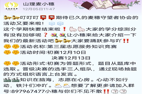 为促进学生思想道德建设,鼓励每个人积极投入到志愿服务中去,让在校学生了解并积极参加此次志愿服务知识竞赛活动,太阳成集团tyc122cc入口麦穗守望者协会于12月6日至9日举办第三届志愿服务知识竞赛宣传活动。希望同学们能在生活中做到志愿先行,做积极向上的当代青年大学生。