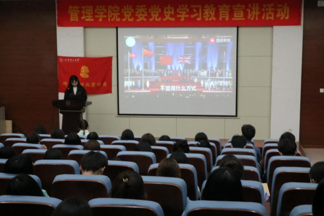 4月8日晚,管理学院于4号教学楼二楼报告厅组织党委党史学习教育宣讲。此次宣讲由研究生时政宣讲团学生代表付佳艺、孙艺菡主讲,学院学生代表参加。