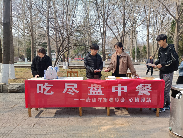 值此第五十八个“学雷锋”纪念日与第二十二个“中国青年志愿服务日”,弘扬雷锋精神,展现当代大学生的责任势在必行。光盘也是一种公益,节俭节约亦是重要的雷锋精神。因此,麦穗守望者与心晴驿站协会于3月12日至3月15日在东校区餐厅门口举行“吃尽盘中餐”的宣传活动。当代大学生必须深入地了解、关注食品浪费现象,从细微处着手弘扬雷锋精神。