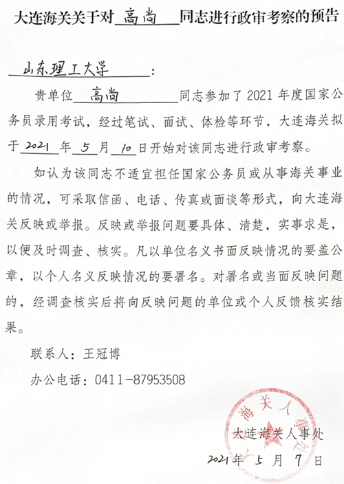 [公示·管理]大连海关关于对高尚同志进行政审考察的预告
