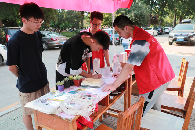 活动期间,线上设置捐赠群,学生积极加群并将资料发送给工作人员,工作人员根据捐赠内容进行分类保存。线下设置捐赠点,学生根据报名表所填信息进行图书捐赠,将捐赠图书送至东校区餐厅南侧捐赠站点,工作人员协助学生及时完成信息登记核对任务。此外,到场捐赠图书的同学可参与抽奖活动领取精美礼品。活动开展过程中,工作人员向学生宣传活动内容与活动意义,维持现场秩序,使得线下募捐活动有序开展。