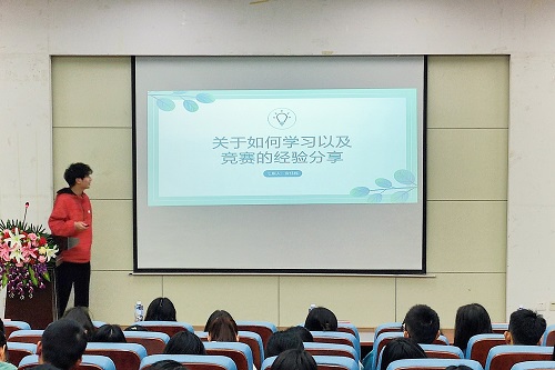 随后,宣佳栋上台分享学习与竞赛经验。关于学习,他提到上课要及时记录,整理笔记,留意重点案例,学好专业课知识。在竞赛方面,他重点讲解商赛、调研类竞赛和科创类竞赛的相关内容,包括如何获取优质的竞赛资源以及竞赛的注意事项等。