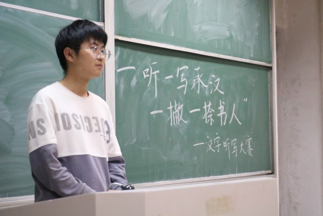 活动伊始,仲浩向参赛学生简单介绍汉字听写大赛的规则及注意事项。他讲到,此次活动以卷面形式开展,比赛分为汉字听写、汉字笔画、汉字组字三个环节。在“汉字听写”环节,由仲浩朗读考题,参赛学生充分思考后认真作答,在答卷上写下相应成语。在“汉字笔画”环节,由考官朗读汉字,参赛成员在答卷上用阿拉伯数字写下该汉字的笔画数。现场气氛良好,参赛学生沉着冷静、认真聆听、快速思考、规范书写。最后是“汉字组字”环节,考官在黑板上写下“氵”、“月 ”、“阝”、“礻”四个部首,参赛学生依次将四个部首各组五个汉字后写在答卷上。比赛结束后由工作人员将考卷收起,参赛学生有序离场。