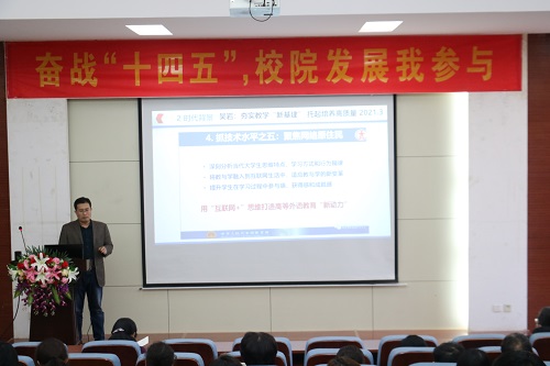会议伊始,张厚升从“教学要实现创新,要实现革命”的角度出发,围绕比赛介绍、时代背景、各环节分析、我的设计汇报与展望五个方面向全体教师展开阐述。张厚升从教学创新大赛展开介绍,向教师们介绍国家级竞赛与校级竞赛的相关内容。接着,他从中国高等教育迈入新阶段的时代背景出发,对于如何抓好人才培养四项“新基建”的问题,他提出加强价值引领、持续打造金课和强化示范带动等解决方法。随后,张厚升从提交材料的基本要求、教学创新维度、智慧教育、做好顶层设计等十二个要点对各环节材料进行具体分析,向教师们介绍教育教学理念、创新特色和“三段·五环·七度”的混合式教学模式。在讲解设计汇报的过程中,他展示自己的教学设计详细汇报的视频二维码,供全体教师学习观看。