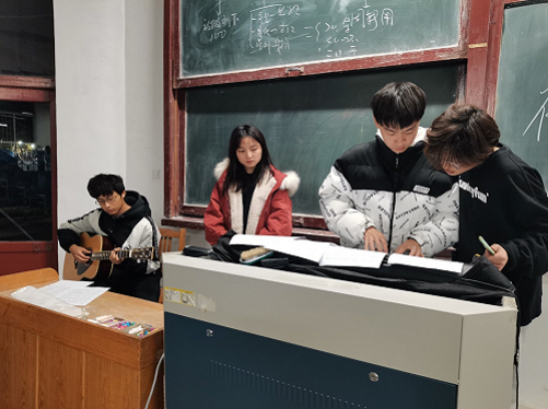 在同学们已经掌握一定的扫弦技巧后,孟露同学又向大家教授扫弦演奏的曲目,如《七里香》《明天你要嫁给我》等。经过孟露同学认真的指导及精密的讲授,同学们已经能大致弹奏出这些曲目,后又经过一定时间的联系,有些天赋型选手已经能够熟练弹奏。