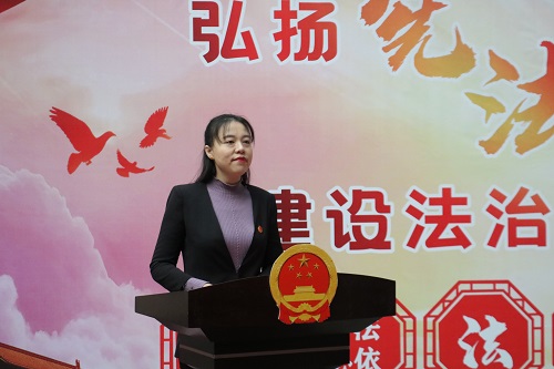 活动伊始,孙婷上台进行发言。她介绍道,今天是第八个国家宪法日,设立国家宪法日传递的是依宪治国、依宪执政的理念,作为青年大学生应主动遵守宪法,学习宪法,发挥模范带头作用,让宪法思维内化于心,外化于行。她从三个方面强调青年大学生应该如何做:一是知法,青年学生必须学习法律知识,树立法治观念,养成主人翁意识;二是守法,学生应坚持听党话、跟党走,培养法治思维,遵守校纪校规,争做“五有”人才;三是用法,她倡导青年学生要坚持用法治理念思考和解决问题,以自己的实际行动,带动全社会树立对法治的信仰,汇聚起建设法治中国的强大力量。