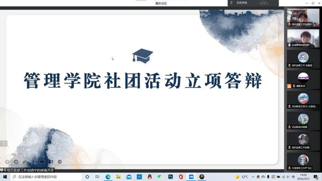 此次答辩会采用线上会议的方式举行,特邀管理学院各位社团指导老师、社团联合会负责人、各社团会长及各位社联社团代表线上指导,由学院社团联合会组织监察工作刘清华主持,学院全体社团负责人参与,进行PPT展示和答辩。