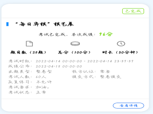 活动分为线上打卡和易班答题两部分:4月7日—4月13日参赛成员需进行七天围棋打卡。参赛者需自行寻找棋友约棋,并于当天将对弈截图上传至群相册。每日打卡参与可得1分,未参与得0分,当日对弈胜者计1分,负者计0分。4月14日则通过易班进行线上答题,题目范围为题库中随机抽取的25道题,每题四分,共一百分。七天打卡总分和答题分数累计,作为参赛者最终得分。