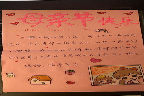 活动过程中每个参赛团队在规定日期内制作一份贺卡,自行设计贺卡外侧封面,贺卡内侧内容主要关于对母亲的寄语。紧接着每个参赛小组选出一份自认为较好的贺卡并上交活动负责人。活动负责人会安排人员对参赛作品进行评分。最终根据评分结果给予一等奖一名,二等奖两名,三等奖三名。