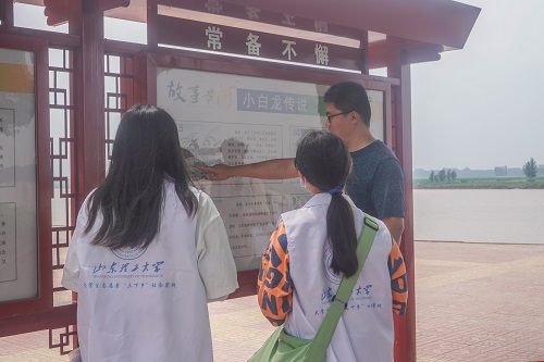 随后,实践团成员在清河镇人大常委副主席许亚男和清河镇宣传办主任陈晓杰的陪同下,参观渡口文化广场及白龙湾风景区。在参观渡口文化广场时,陈晓杰向实践团讲述陈毅、粟裕带领红军战士渡河的故事,并说道,建设渡口文化广场的目的是为了向广大人民群众传播红色文化。紧接着,他带领实践团成员参观白龙湾险工,当地政府为传播白龙湾非遗故事,建设白龙湾幸福广场与特色文化展板,将白龙湾传说以木版年画形式展示,把黄河文化融入居民生活,潜移默化,实现文化传播。实践团成员沿白龙湾险堤步行参观,切实感受到黄河白龙湾的壮阔与沿黄乡镇文化建设的实际成果。