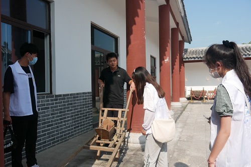 随后,尹作峰为实践团成员介绍民俗馆的一系列展品。他讲到,民俗馆中的展品可以分为三类,分别是木匠工具,耕种工具以及铁匠工具,并亲自为实践团成员演示墨斗,牵钻,耧,石碾盘等工具的使用方法。最后,尹作峰提到,这些旧农具,是传承千年的农耕文明的见证者,虽然时代的高速发展让这些工具逐渐退出历史舞台,但农耕文明的传承应当生生不息,增强青年人的土地情怀、吸引人才返乡发展,是焦庙镇未来规划发展的难点以及重点。
