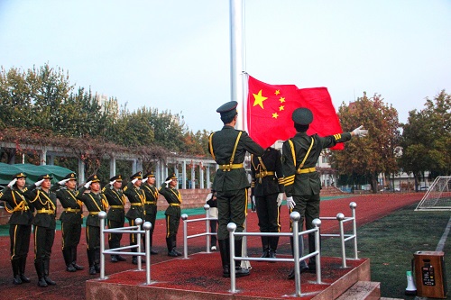 迎着初升的朝阳,国旗护卫队迈着整齐有力的步伐,护卫五星红旗入场,伴随着雄壮嘹亮的《义勇军进行曲》,全体师生满怀敬意凝视五星红旗冉冉升起,随风飘扬。