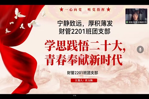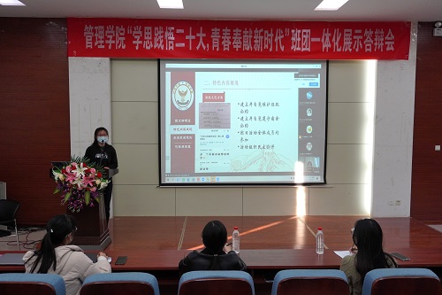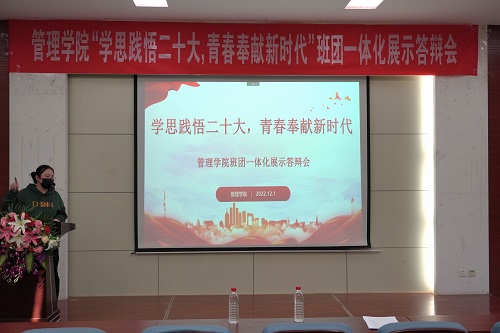 为强化新生团支部基础建设,增强团员青年的政治意识和团支部的凝聚力,形成群策主力、特色鲜明的高质量团支部,12月1日下午,管理学院在4号教学楼二楼报告厅举办“学思践悟二十大,青春奉献新时代”班团一体化展示答辩会。此次答辩会由会计2201班团支书满梓祎主持,2022级辅导员靳祺、国瑞坤及团建事务活动工作工作人员担任评委,2022级全体团支书参与。