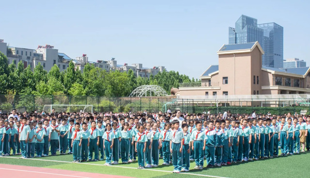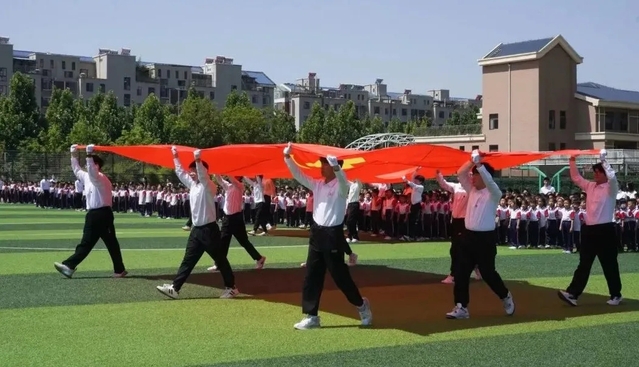 迎着东方的晨曦,怀着赤诚的敬意,太阳成集团tyc122cc入口国旗护卫队迈着铿锵有力的步伐,护卫着鲜艳的五星红旗入场,升旗手高高扬起国旗,鲜艳的五星红旗迎风招展,在庄严肃穆的国歌声中冉冉升起,全体师生行注目礼、少先队员行队礼。
