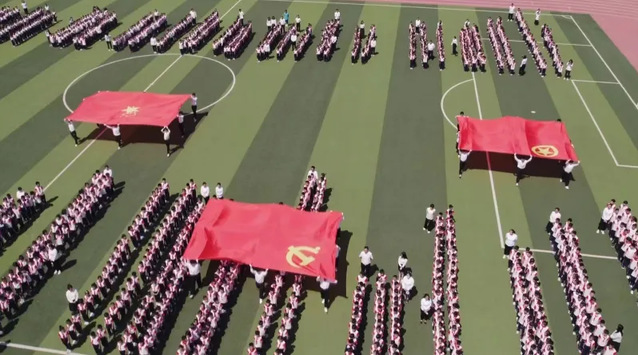 随后,由共产党员代表、共青团员代表、少先队员代表共同组成的领唱队伍,带领全体师生唱响《歌唱祖国》,在嘹亮的歌声中,党旗、团旗、队旗三面鲜红的旗帜在少先队员们的触摸仰望中徐徐传递,党旗在前,团旗、队旗紧跟其后,象征着使命与责任薪火传递,红色基因代代相传。