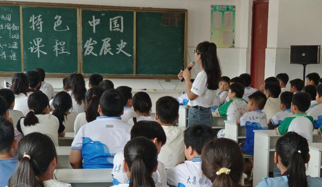 图为实践团成员引领学生了解中国发展史。(韩丽蓉摄)