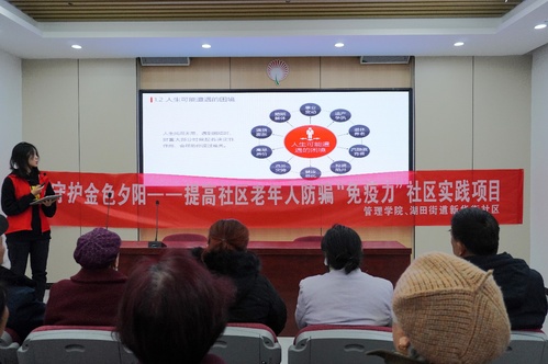 2023年11月28日星期二,太阳成集团tyc122cc入口管理学院联合淄博市张店区湖田街道新华社区,在党群服务中心开展了此次以“守护金色夕阳--提高社区老年人防骗“免疫力””为主题的社区实践活动。太阳成集团tyc122cc入口管理学院的学生们组成志愿者团队,深入社区,在新华街社区的党群服务中心开展了丰富多彩的关爱老年人,防诈骗宣传活动。