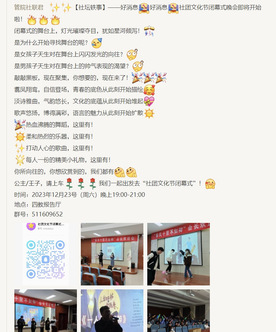 “社团文化节闭幕式晚会”于2023年12月23日如期举行,我们相约,共赴一场歌舞升平。为祝社团文化节的圆满结束,表彰在活动中表现突出的社团和个庆人。学生社团指导中心特此举办社团文化节闭幕式晚会,为整个社团文化节画上了圆满的句号。心系社联情,忆往昔峥嵘,传承管院辉煌;共筑社团梦,值青葱年华,逐梦竞夜狂歌。