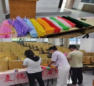 活动开始前,工作人员准备相关材料,将材料整齐摆放,并组织参与活动的同学进行组队,每三人为一组,在线上填写报名表。活动开始后,参与活动的同学来到领取材料处,在工作人员的指引和帮助下,按照活动规则领取相应的手工材料。